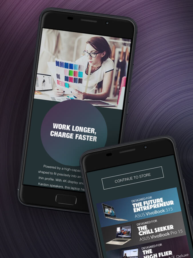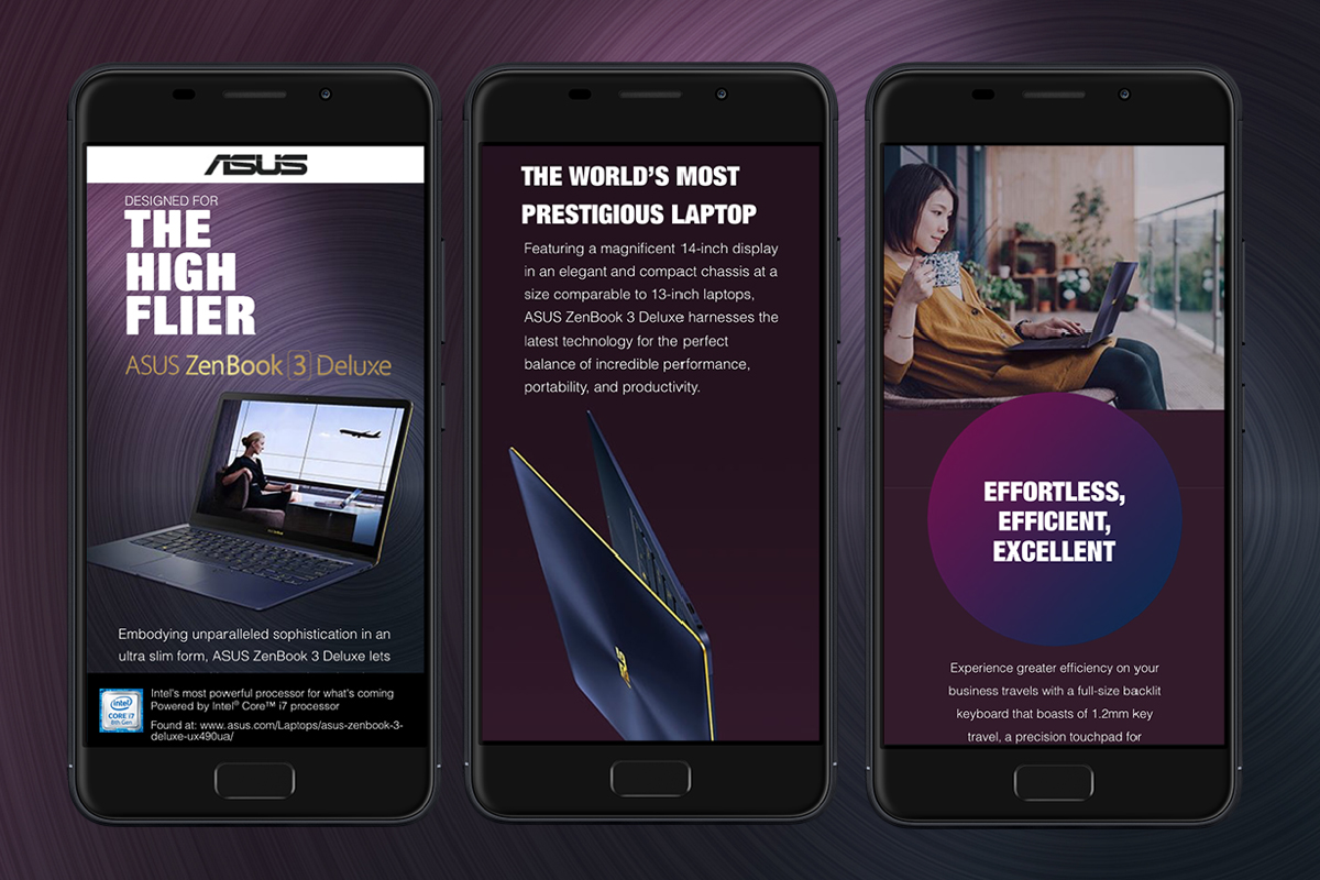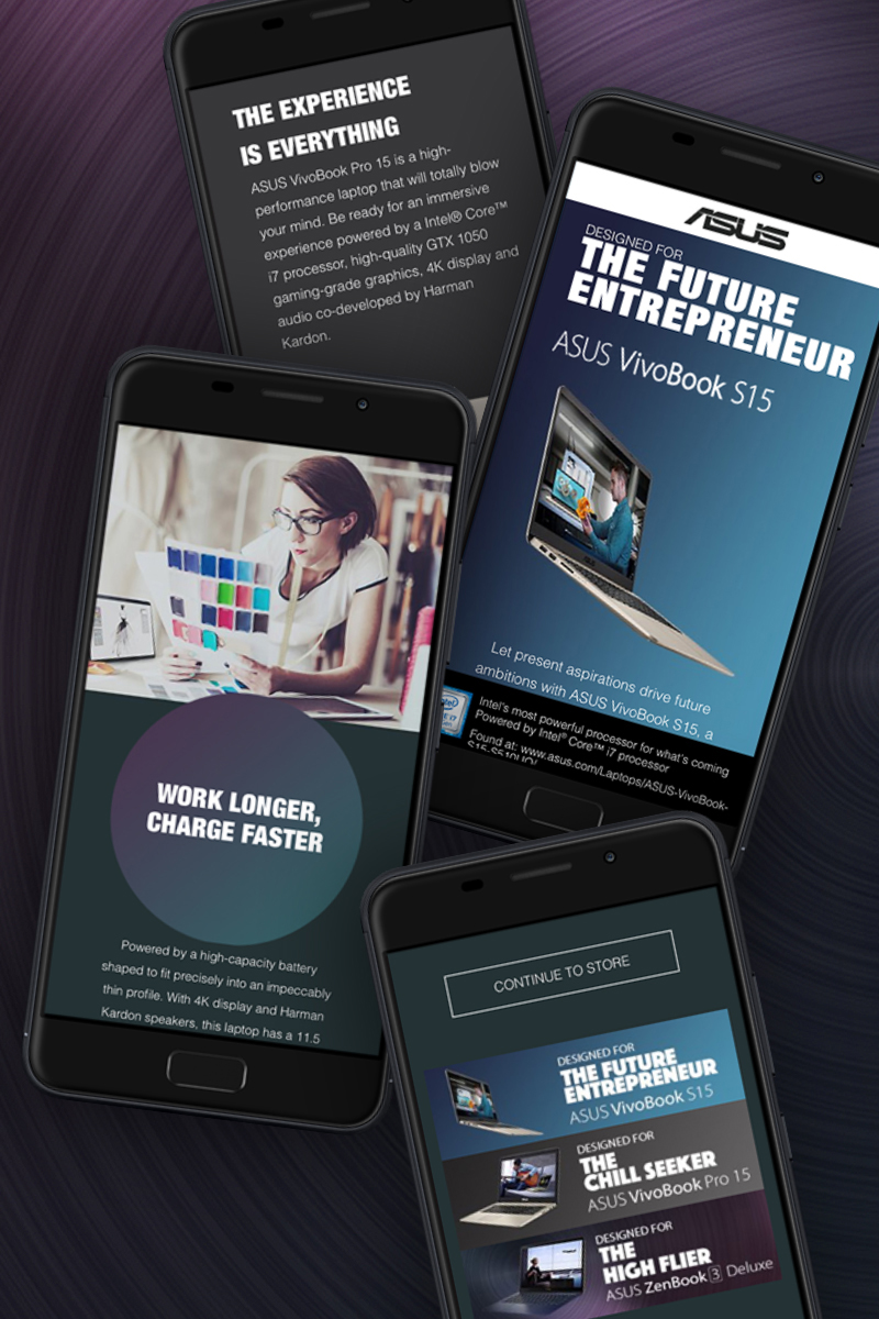 Für den Kunden ASUS haben wir eine Online-Kampagne der ZenBook und VivoBook-Serie konzipiert. Dazu habe ich Konzept und Layout der responsive Microsites, Banner uns Posts erstellt.