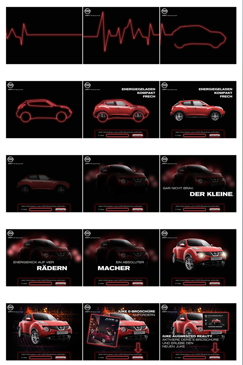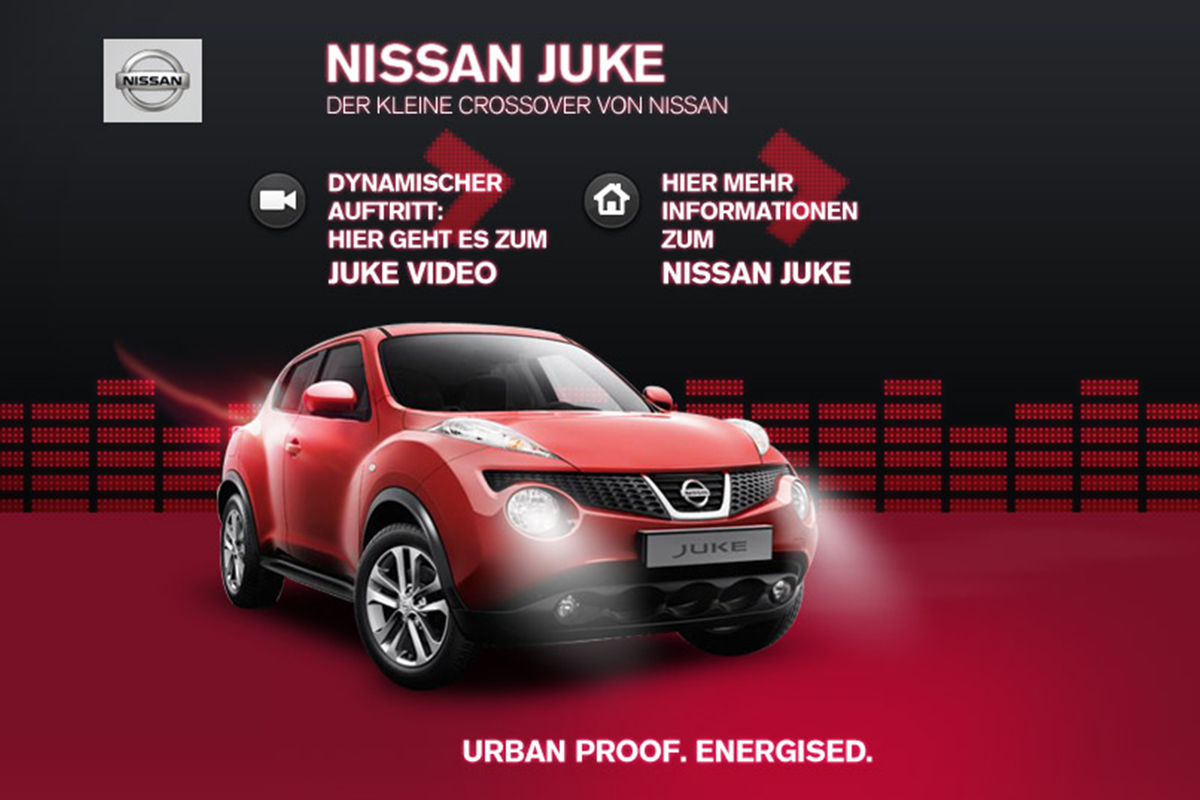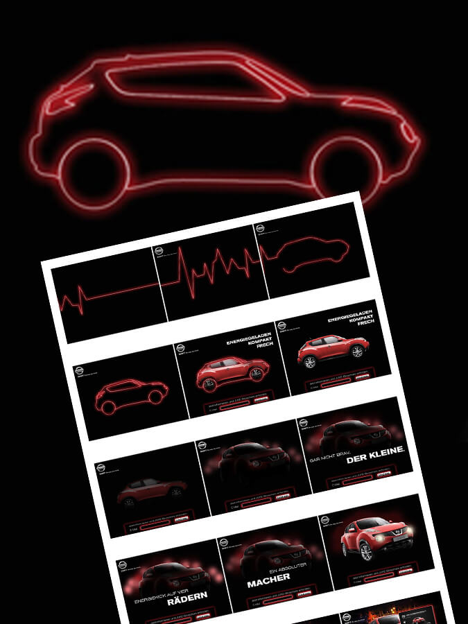 Für den Kunden NISSAN haben wir Bannerkampagnen und Microsites erstellt, z.B. für den NISSAN JUKE. Dabei war ich für die Storyboards, Layouts und die Bannerproduktion hauptverantwortlich.