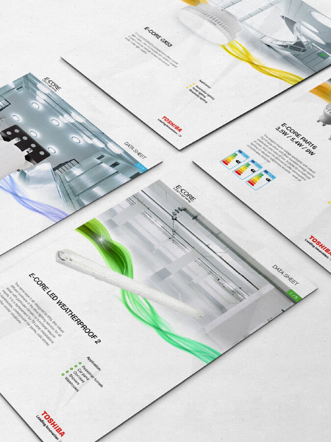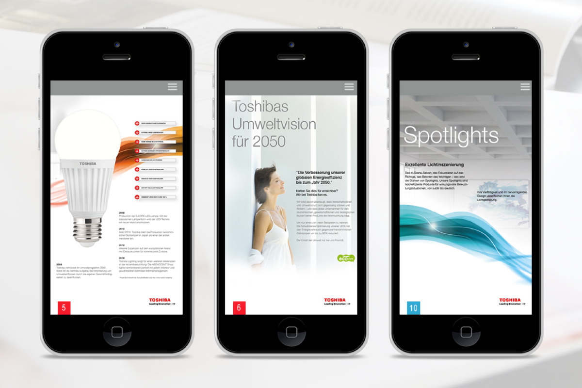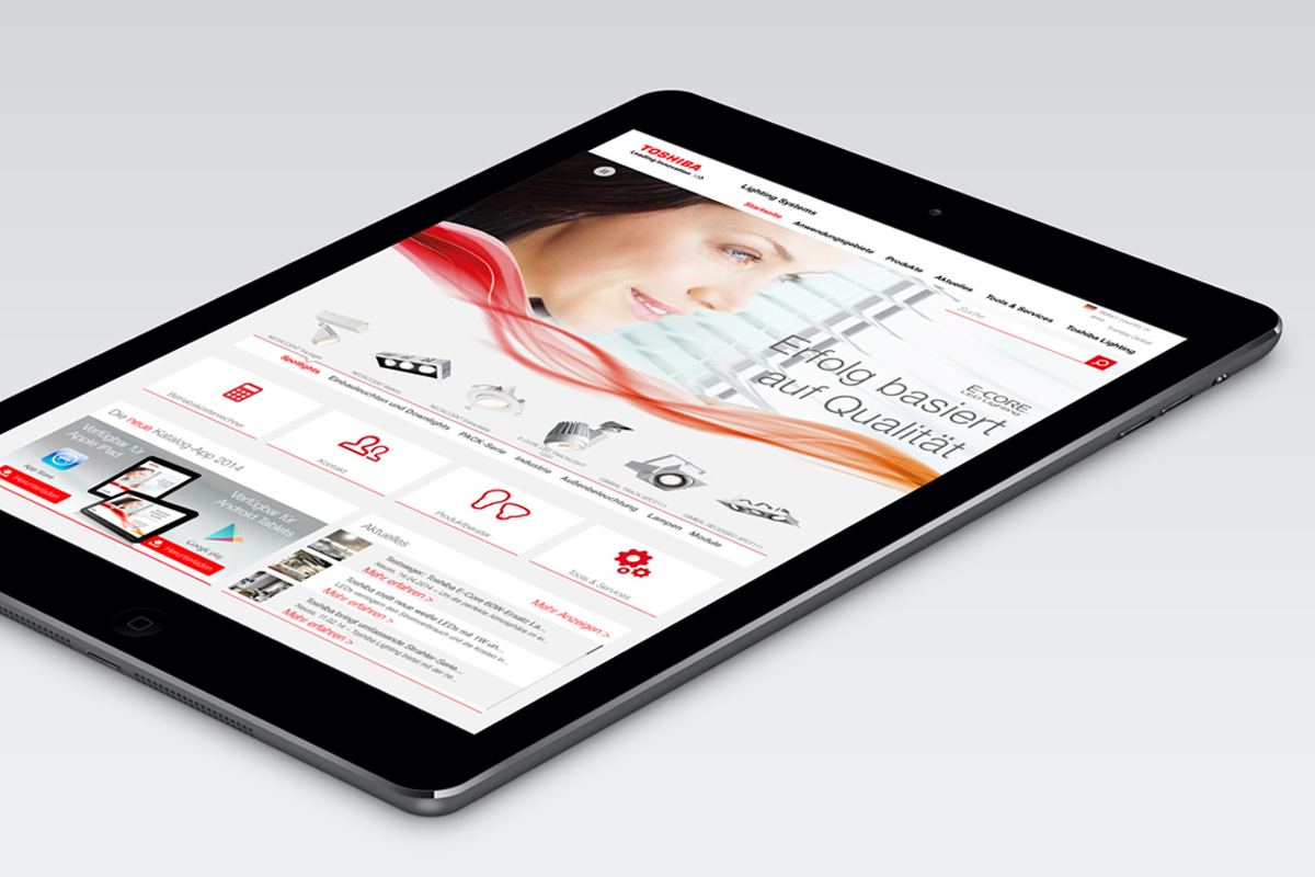 Für die Toshiba Lighting EU war ich für den Aufbau eines einheitlichen CDs verantwortlich, inkl. Styleguide, QS, Katalogerstellung, Relaunch der Website und Erstellung einer Katalog-App.